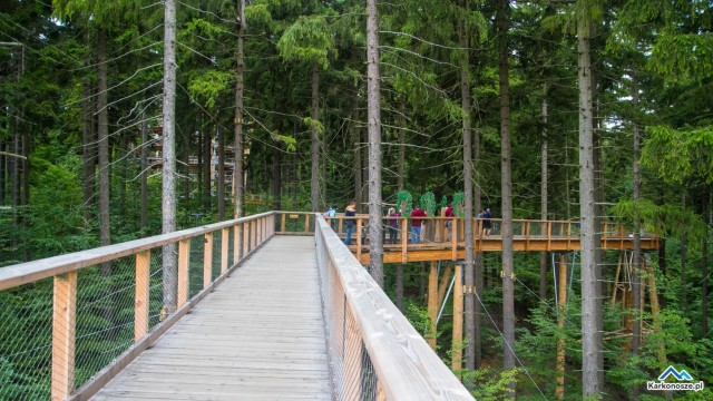 Karkonoska Ścieżka w Koronach Drzew to niebywała atrakcja w Karkonoszach! Położona jest w lesie Karkonoskiego Parku Narodowego, w miejscowości Janské Lázně. Tu możemy stać sie częścią karkonoskiego lasu - trasa Ścieżki w Koronach Drzew ma długość ponad 1300 metrów.