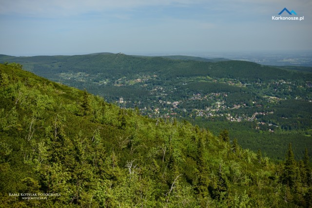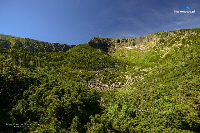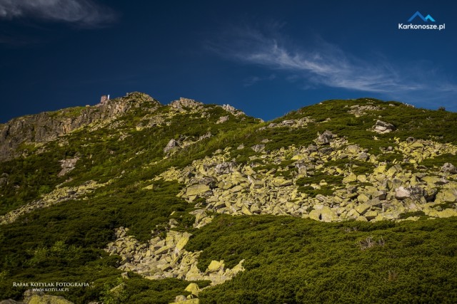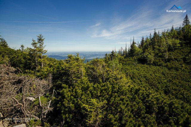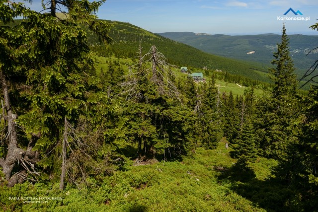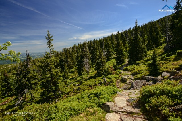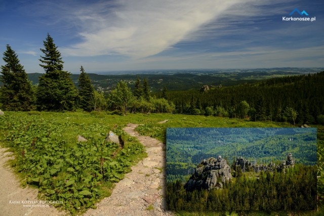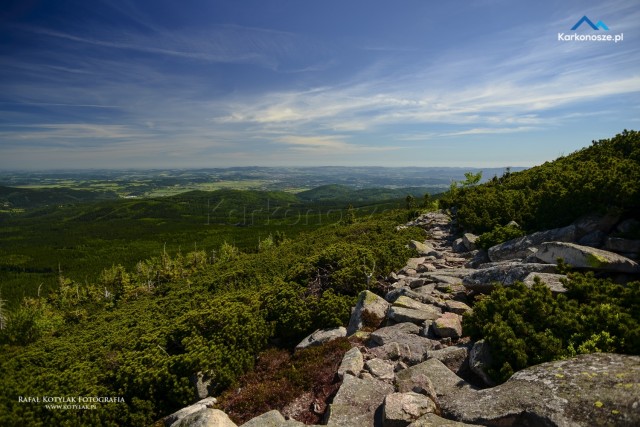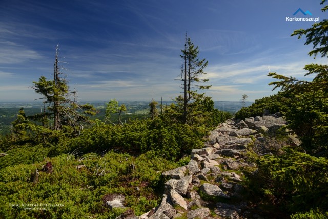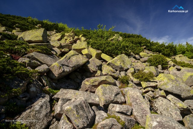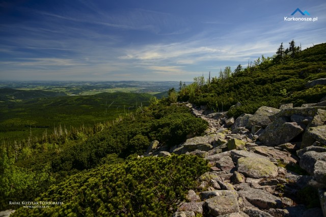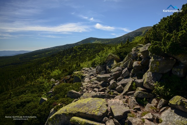 Docieramy do rumowisk pod Łabskim Szczytem - tutaj krajobraz nieco się zmienia, brak tu wysokiego świerkowego lasu, występują tu głównie kosodrzewiny i jarzębiny rosnące pomiędzy sporymi blokami granitu karkonoskiego. Z tego miejsca możemy podziwiać najładniejsze widoki na Kotlinę Jeleniogórską, Rudawy Janowickie, Góry Kaczawskie a przy dobrej widoczności możemy dostrzec podwrocławską górę Ślęża.