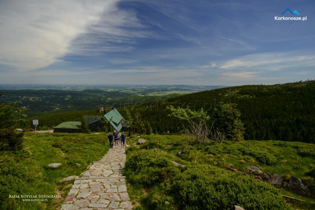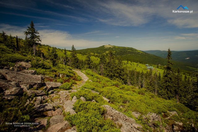 Po krótkiej przerwie ruszamy w kierunku Schroniska pod Łabskim Szczytem, od którego dzieli nas jedynie około 500 metrów. Po przejściu pierwszych 300 metrów wychodzimy z wysokiego lasu a naszym oczom ukazują się wspaniałe widoki na pobliskie Borówczane Skały, Kotlinę Jeleniogórską, Góry Izerskie - Wysoki Kamień, oraz położony na Śląskim Grzbiecie Łabski Szczyt i leżący poniżej Łabski Kocioł, przy którym znajduje się Schronisko pod Łabskim Szczytem, do którego teraz się udamy.