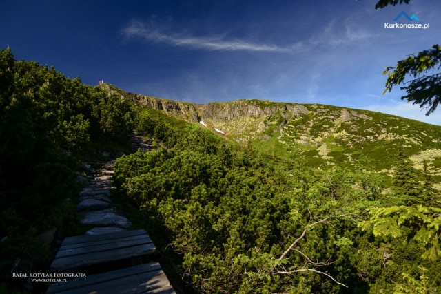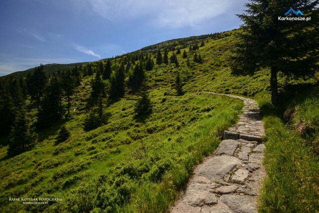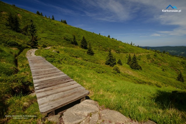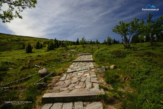 Tu obieramy zielony szlak i nim ruszamy w kierunku Kotłów. Początkowo szlak biegnie zboczem Łabskiego Kotła tutaj możemy podziwiać niesamowite widoki, głównie na Kotlinę Jeleniogórską. Następnie Ścieżka nad Reglami biegnie zboczem Łabskiego Szczytu przez „ Martwy Las”, a za naszymi plecami rozciągają się kolejne wyjątkowe pejzaże - w górze widać Szrenicę, trochę niżej Halę pod Łabskim Szczytem, w tle Góry Izerskie. Odcinek Ścieżki Pod Reglami przebiega głównie kamienistym szlakiem, gdzieniegdzie musimy pokonać drewniane kładki.