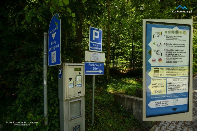 Wycieczkę, jak już wcześniej wspomniałem, rozpoczynamy przy Muzeum Mineralogicznym w Szklarskiej Porębie przy ulicy Kilińskiego 20. Tutaj odnajdziemy początek żółtego szlaku oraz drogowskaz, który pokieruje nas na Śnieżne Kotły. W okolicy muzeum zlokalizowany jest spory parking miejski, na którym możemy pozostawić nasze auto (lub autobus w przypadku wycieczek grupowych). Opłata za parking zależna jest od długości czasu, na jaki chcemy pozostawić auto (dokładny cennik możecie sprawdzić na poniższym zdjęciu). Oczywiście możemy dotrzeć tu pieszo - odległość od centrum Szklarskiej Poręby (Skwer Radiowej Trójki) to 1,3km.