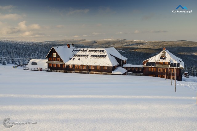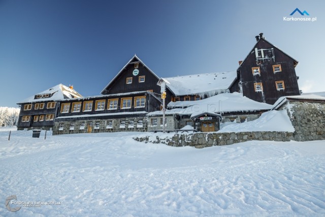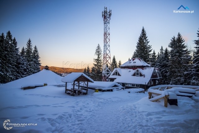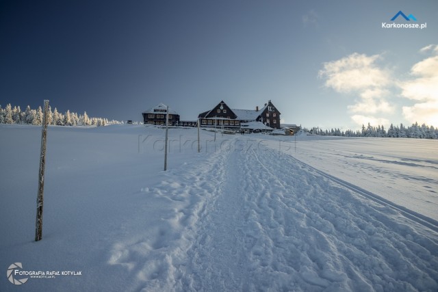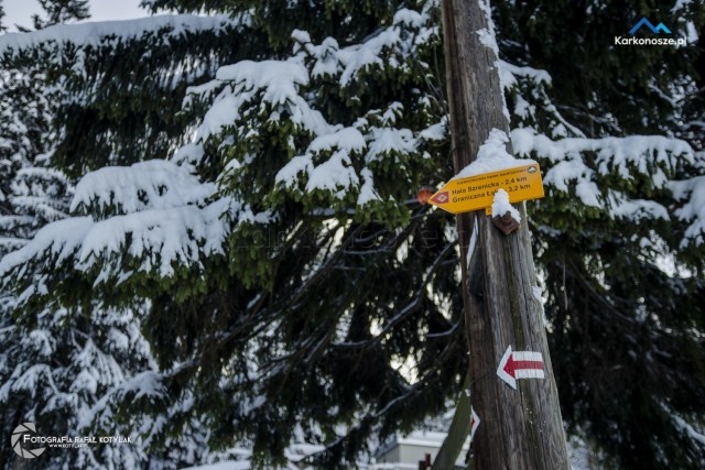 Po krótkim odpoczynku udajemy się na ostatnią część naszej trasy, która ma długość 1,2 kilometra i doprowadzi nas do celu wyprawy - szczytu Szrenica. Tuż przed wejściem do Schroniska na Hali Szrenickiej znajduje się drogowskaz z oznaczonym czerwonym szlakiem do Granicznej Łąki, położonej tuż poniżej Szrenicy. Szlak pnie się ostro pod górę, ale zmęczenie wynagradzają otaczające nas widoki, a ośnieżone świerkowe drzewa tworzą wspaniałe białe formacje. Za plecami - w zimowej scenerii na tle karkonoskiego lasu Schronisko na Hali Szrenickiej, w oddali - szeroka panorama na Góry Izerskie. Po kilkuset metrach po lewej stronie dostrzeżemy także Schronisko na Szrenicy.